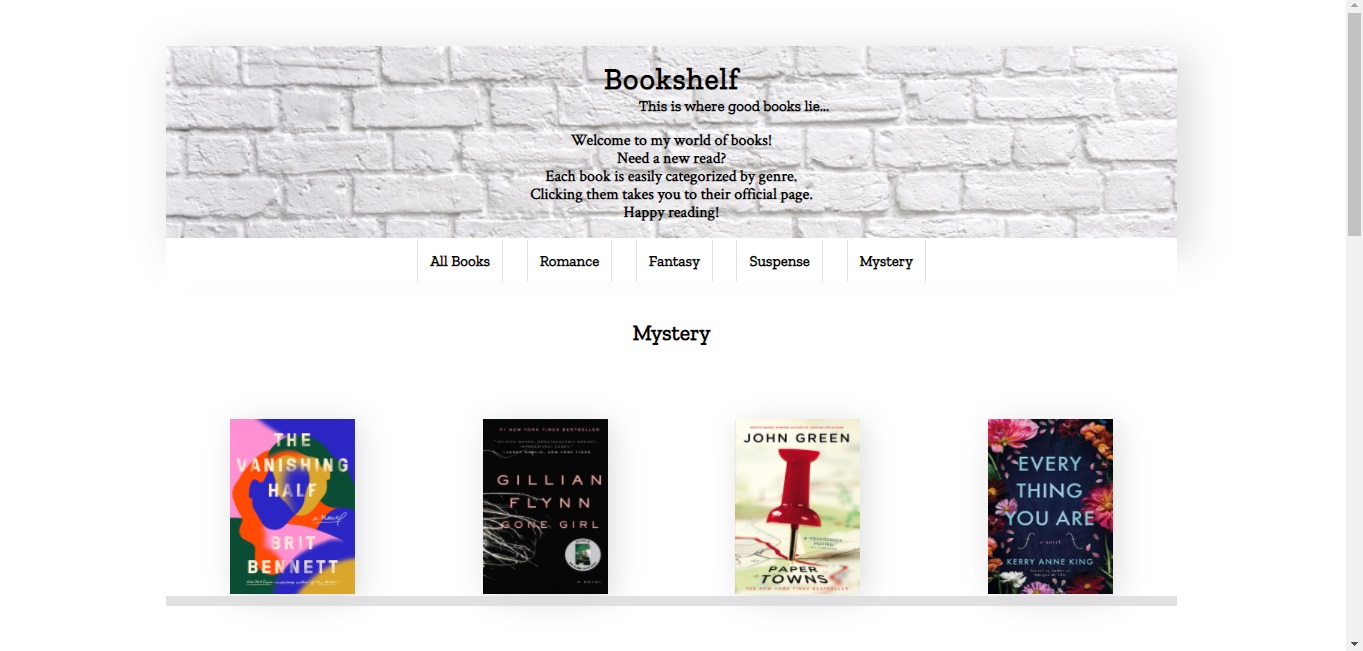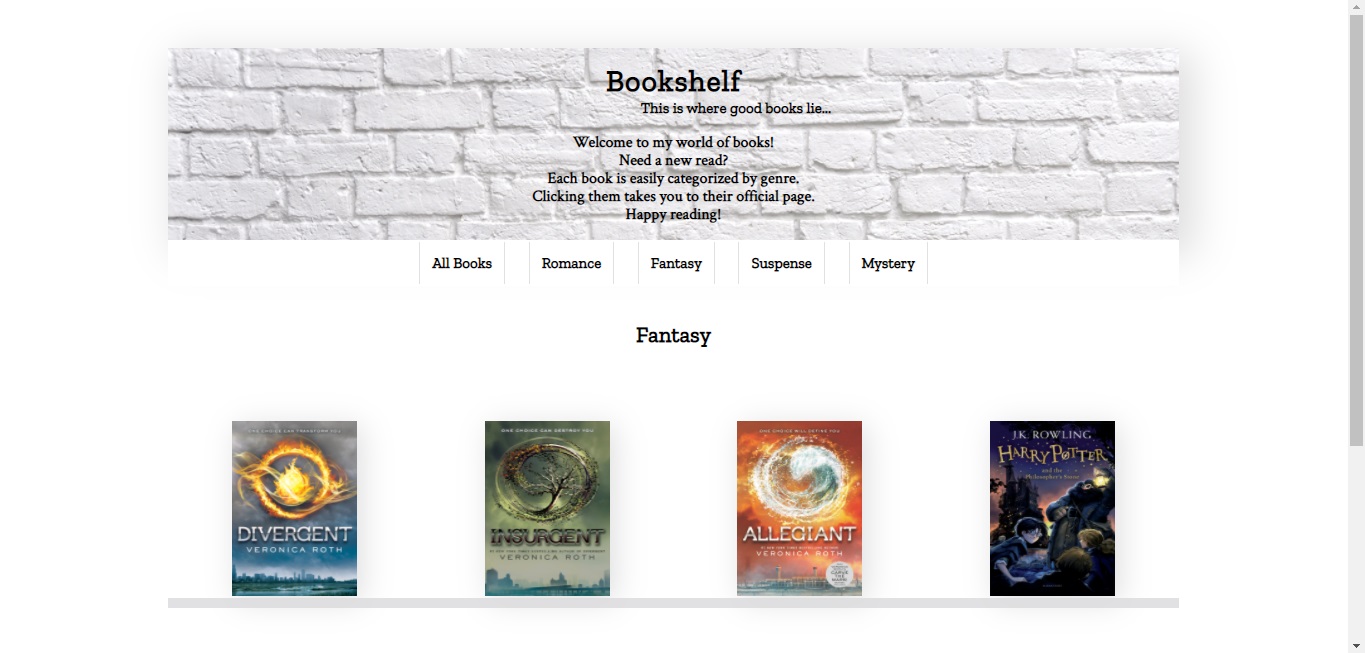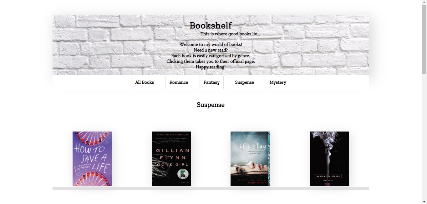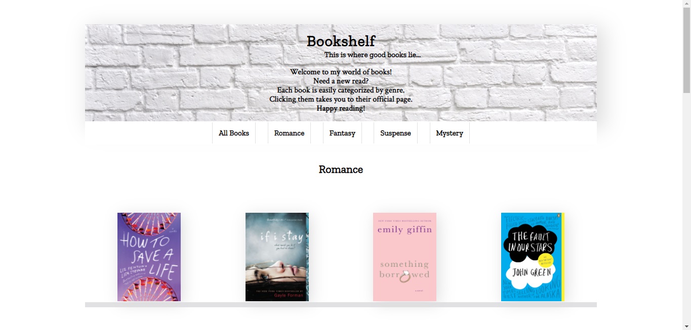 I came up with the idea of a Bookshelf page because reading is one of my passions. I'm a heavy-duty reader. I recommend books in the genres of romance, fantasy, suspense, and mystery. Romance is my favorite genre. Fantasy is my least favorite.